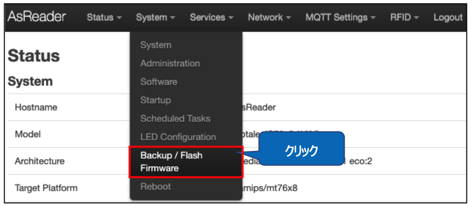上部メニューの「System」→「Backup / Flash Firmware」をクリックしてください。