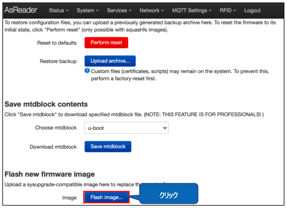 画面下部の「Flash new firmware image」→「Flash image」をクリックしてください。