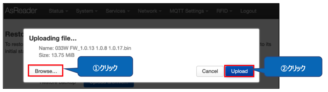 「Browse」をクリックし、ファームウェアのファイルを選択した後、「Upload」をクリックしてください。