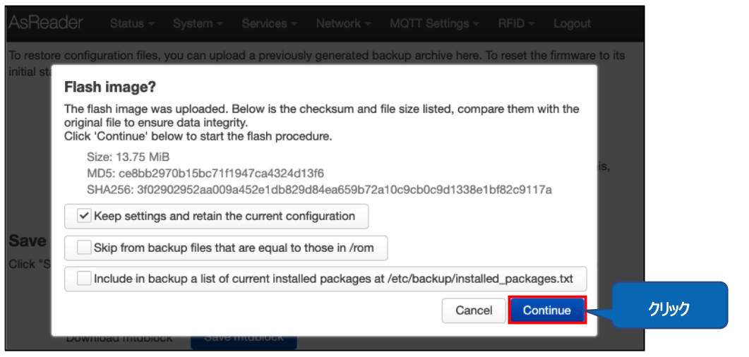 「Continue」をクリックすると、ファームウェアの更新が開始されます。更新完了後、AsReader は自動的に再起動します。