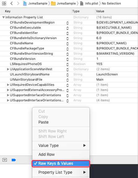 info.plist ファイル内で右クリックし、表示されるメニューから 「Raw Keys & Values」 を選択してください。