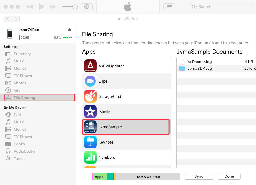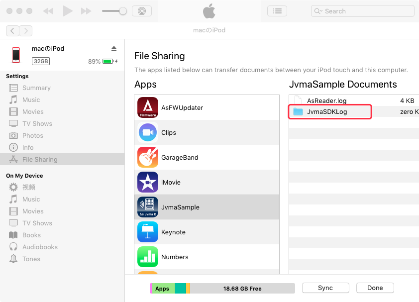 iTunesのファイル共有機能を有効にし、iOSデバイスをiTunesに接続することで、アプリ内に保存されたLogファイルをPCから取得できるようになります。