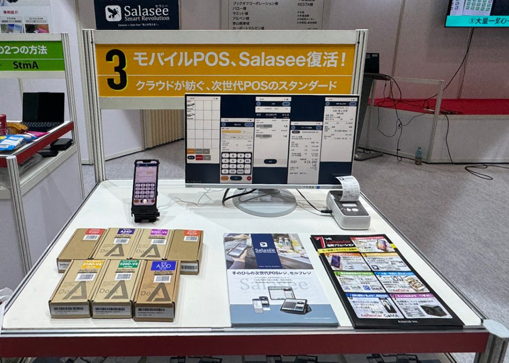 約10年前に訳あって手放した当社オリジナルのモバイルPOSソリューションSalasee が進化して帰ってきました。スマホ1つでどんなレジ業務ができるのか?を大きなモニターで実演させていただきました。