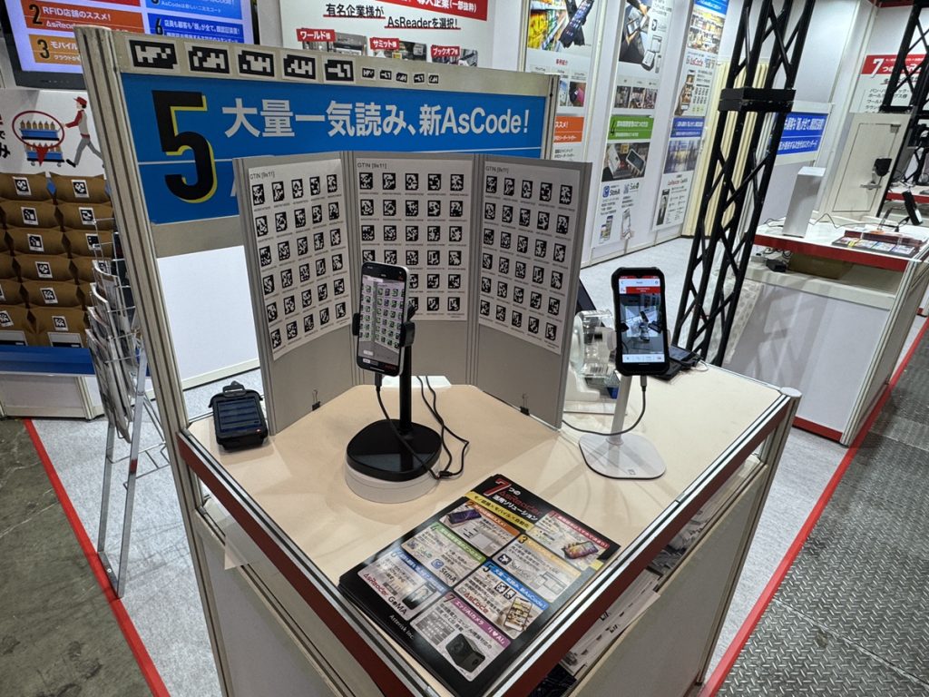 技術ゾーンでは、当社オリジナルの新二次元コードAsCode(アズコード)の展示をメインに行いました。「バーコードや二次元コードはひとつずつ読むもの」という概念を打ち破り、スマホのカメラで映る範囲のたくさんのコードを一気に読み取るソリューションです。AcCodeの活用により、これまでの「たくさんのコードを読む」という作業が劇的に変化します。